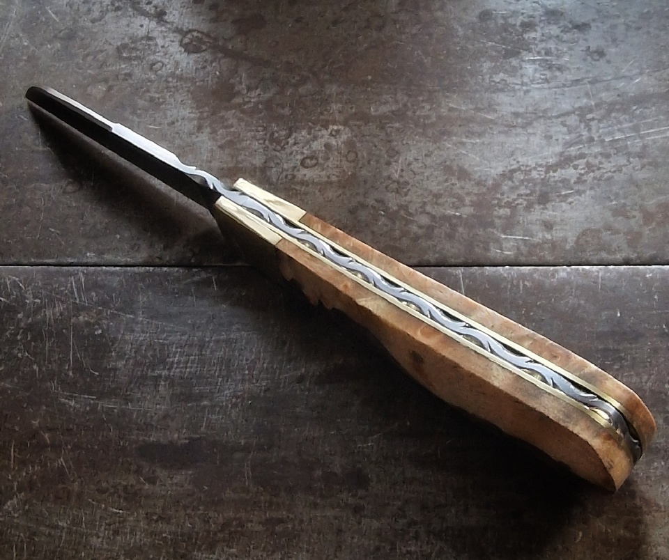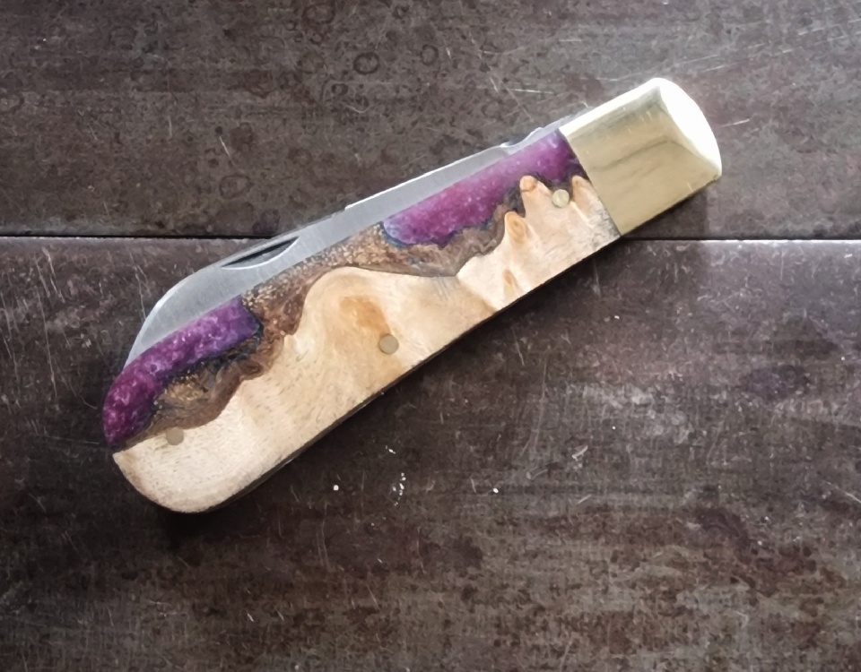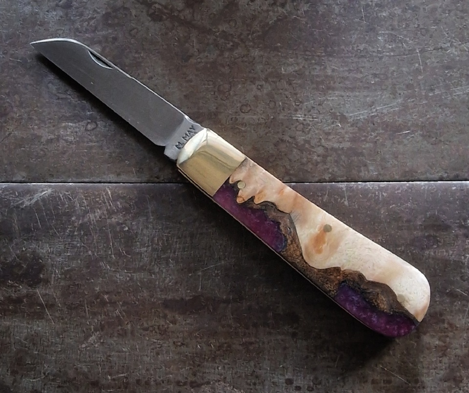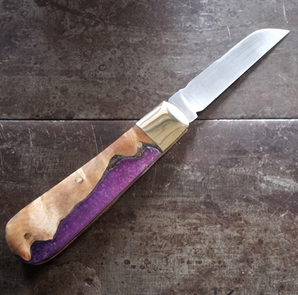 ‘M MAY Sheffield England’ - elm burr and purple resin hybrid scales